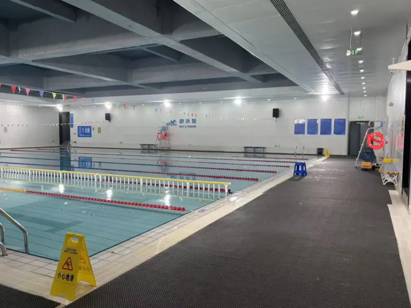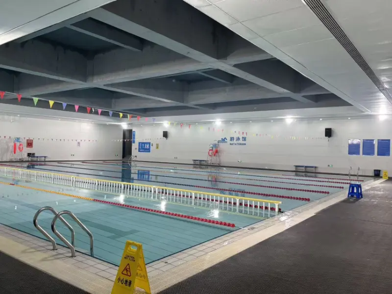 Plaukimo baseino išorėje yra metalinių žuvų žvynų plokščių sistema, sukurianti mastelį primenantį šviesos ir šešėlio efektą, kuris keičiasi atsižvelgiant į fasado kreivumą ir saulės šviesos kryptį, sustiprindamas „vandens tėkmę“. Atidengiama visa vidaus baseino zonos stogo konstrukcija su 48 metrų ilgio santvara, pabrėžiančia aiškią struktūrinės logikos išraišką ir sustiprinanti sporto vietos erdvinį mastelį ir galios pojūtį. Vietoje yra du baseinai: varžybų baseinas ir treniruočių baseinas. Varžybų baseinas yra 50 metrų ilgio ir 25 metrų pločio, 8 takelių; treniruočių baseinas yra 50 metrų ilgio ir 17 metrų pločio, 6 takelių. Abu baseinai yra 2 metrų gylyje.
